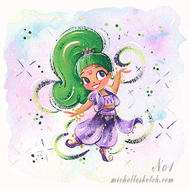 This is a fine art reproduction of an original painting with cute teeny green genies. Available in two sizes: 4x4 inches and 5x5 inches.