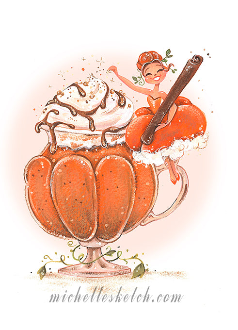 This is a fine art reproduction of an original painting with pumpkin spice latte girl. Available in two sizes: 4x6 inches and 5x7 inches.