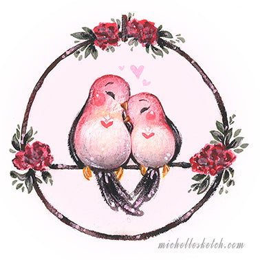 This is a fine art reproduction of an original painting with Valentine Lovebirds. Available in two sizes : 4x4 inches and 5x5 inches.