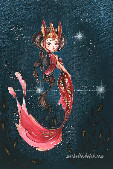 This is a fine art reproduction of an original painting with Padme Mermaid. Available in two sizes: 4x6 inches and 5x7 inches.